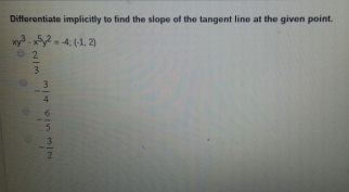 Differentiate implicitly to find the slope of the tangent line at the given point.?